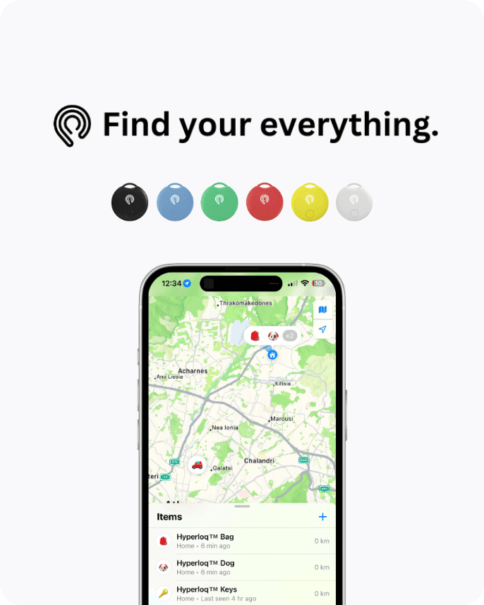 Ψάχνετε συχνά να βρείτε τα κλειδιά, το πορτοφόλι, το αμάξι σας ή ακόμα και το κατοικίδιό σας; Οι παραδοσιακές μέθοδοι παρακολούθησης μπορεί να είναι αναξιόπιστες και δυσκίνητες. Το Hyperloq™ προσφέρει μια έξυπνη, αξιόπιστη και κομψή λύση για να κρατάτε τα βασικά σας αντικείμενα σε απόσταση αναπνοής, ώστε να μπορείτε να εστιάσετε σε αυτό που πραγματικά έχει σημασία για εσάς ξέγνοιαστα.